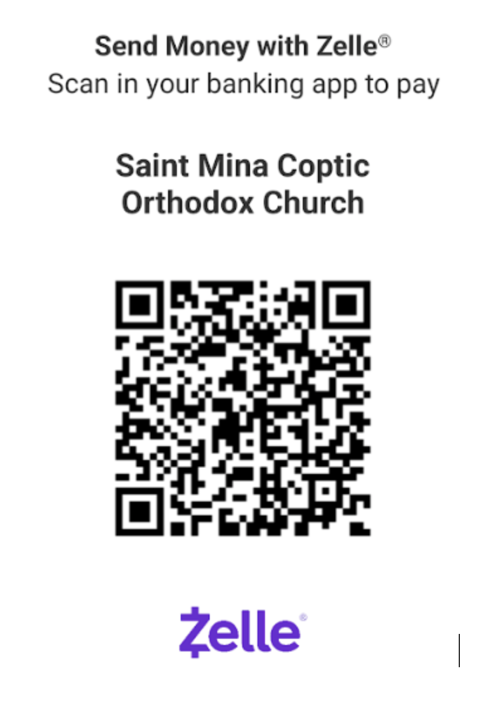 Donate using Zelle: You can donate directly using your bank account with Zelle®. Add St. Mina’s Coptic Church using the email address treasury@stminas.org or use the QR Code below to scan within the Zelle® app on your mobile phone. If you would like a year-end donation statement when donating using Zelle®, please make sure to include your full name and delivery address (mailing address or e-mail address) in the optional message when sending a Zelle® donation.
